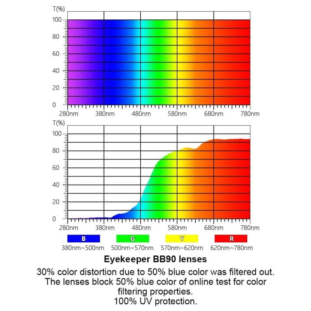 - Blockiert 90 % blaues Licht, 30 % Farbverzerrung