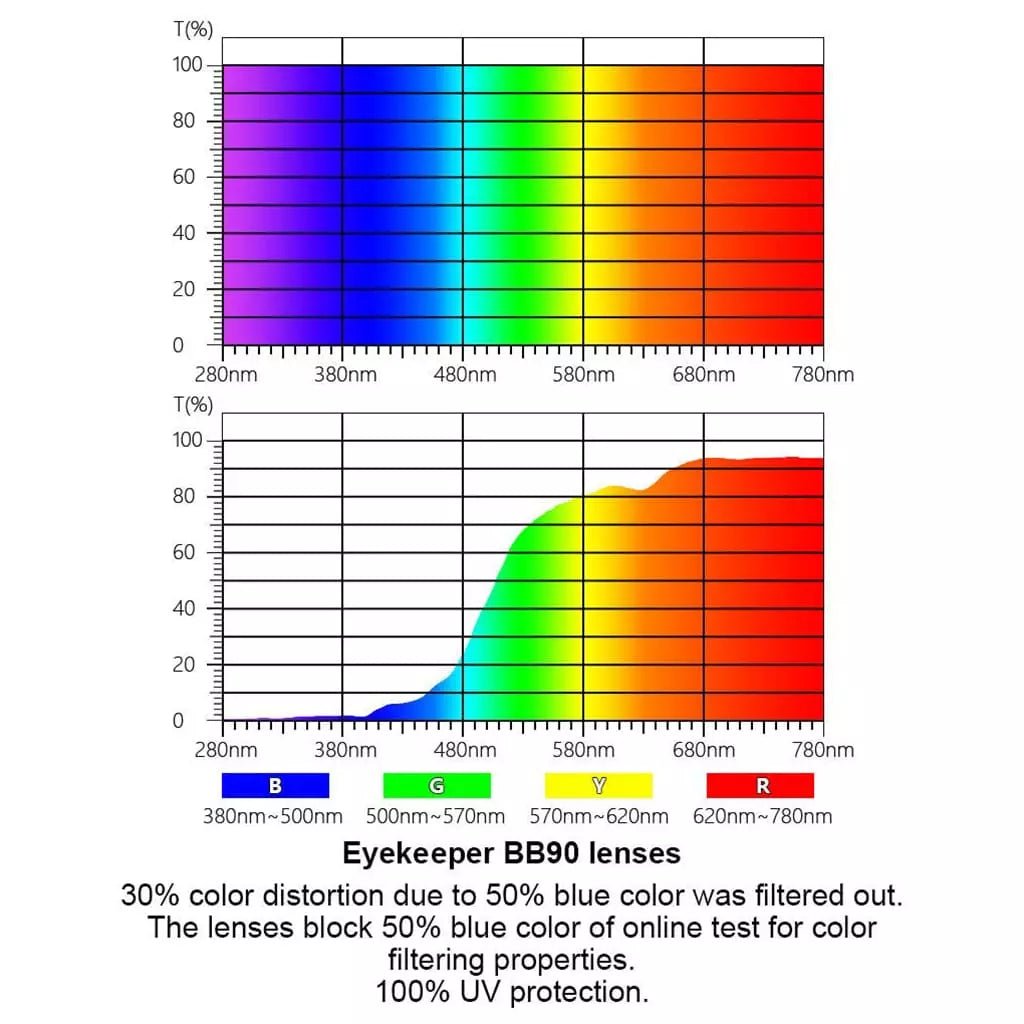 - Blockiert 90 % blaues Licht, 30 % Farbverzerrung